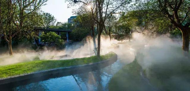• 新瑞佳人工湖景觀噴霧系統的工作原理是利用特制的造霧機組,將水經耐高壓管線由專業噴頭產生1—15微米(0、001mm)的水滴,由此激發成的霧滴能長時間懸浮、漂浮在空氣