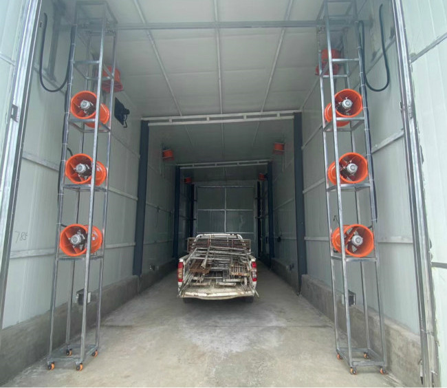 • 車輛烘干系統?烘干房兩側建有耳房,便于熱風流通循環。車輛洗消一體機主要是針對養殖場內運輸車輛,進行徹底的清洗、消毒、烘干。防止車輛帶來的病原體擴散,達到預防及防治的目