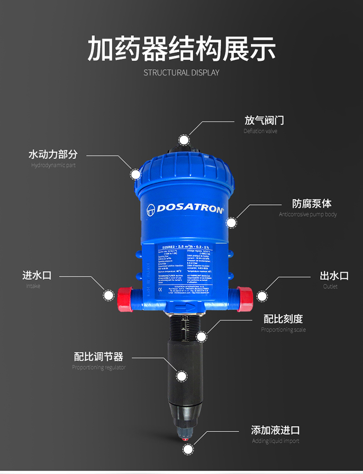 河南新瑞佳實業有限公司代理法國DOSATRON(多仕創/多壽/多薩同)水力比例加藥泵/多壽加藥器/投加泵,水力比例混合加藥泵。