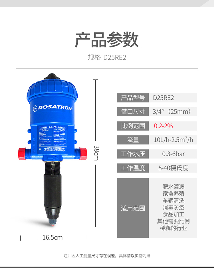 法國原裝進口DOSATRON品牌/多壽品牌水動力比例加藥器/水力比例稀釋器D25RE2參數: