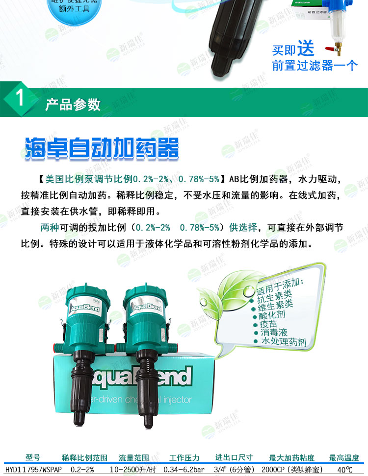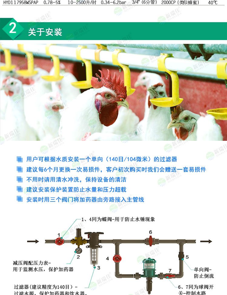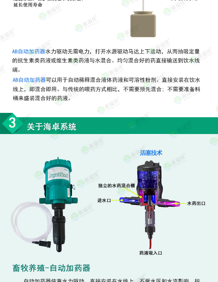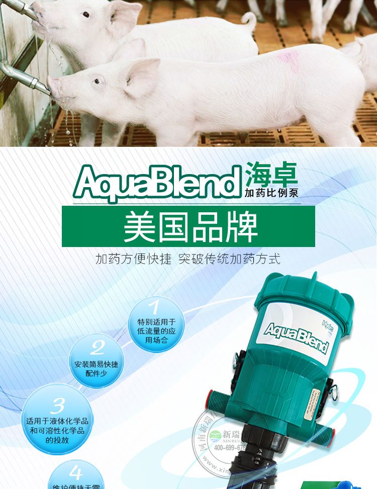 海卓(Hydro)AB比例加藥器使用水力驅動,綠色環保無能耗,打開水源驅動,從而抽吸定量的抗生素類藥液或維生素類藥液與水混合,均勻混合好的水藥直接輸送到飲水線端。