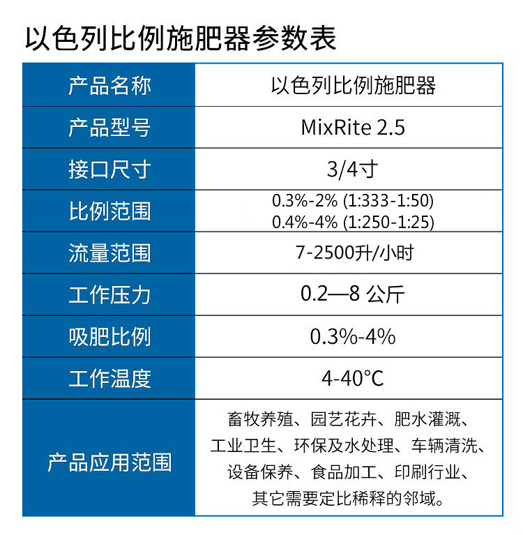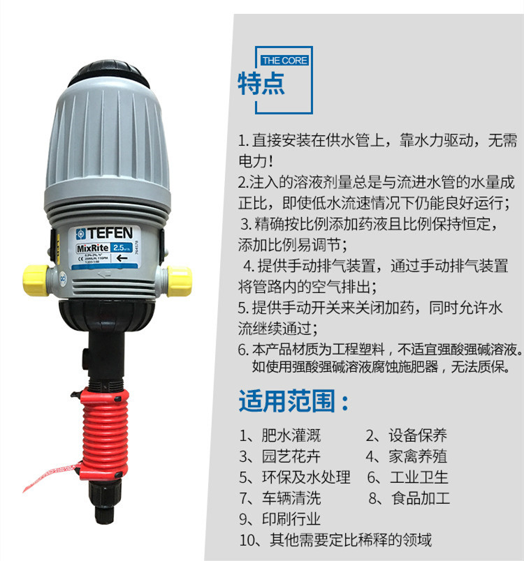 以色列泰芬(TEFEN)公司建立于1970年,公司致力于研究、開發、和制造應用于農業灌溉、醫藥、防疫和工業用途的先進的水泵產品。MixRite(美瑞)牌水動注肥泵(又稱水動注肥器、比例施肥器)為以色列泰芬(TEFEN)公司在制造銷售的注冊產品商標。